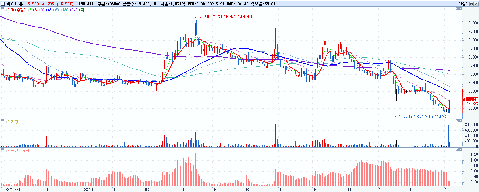 - 에이비온 (5,520원 ▲ 16.58% , 시총: 1,071억, 거래량: 190,833, 거래대금:10억)