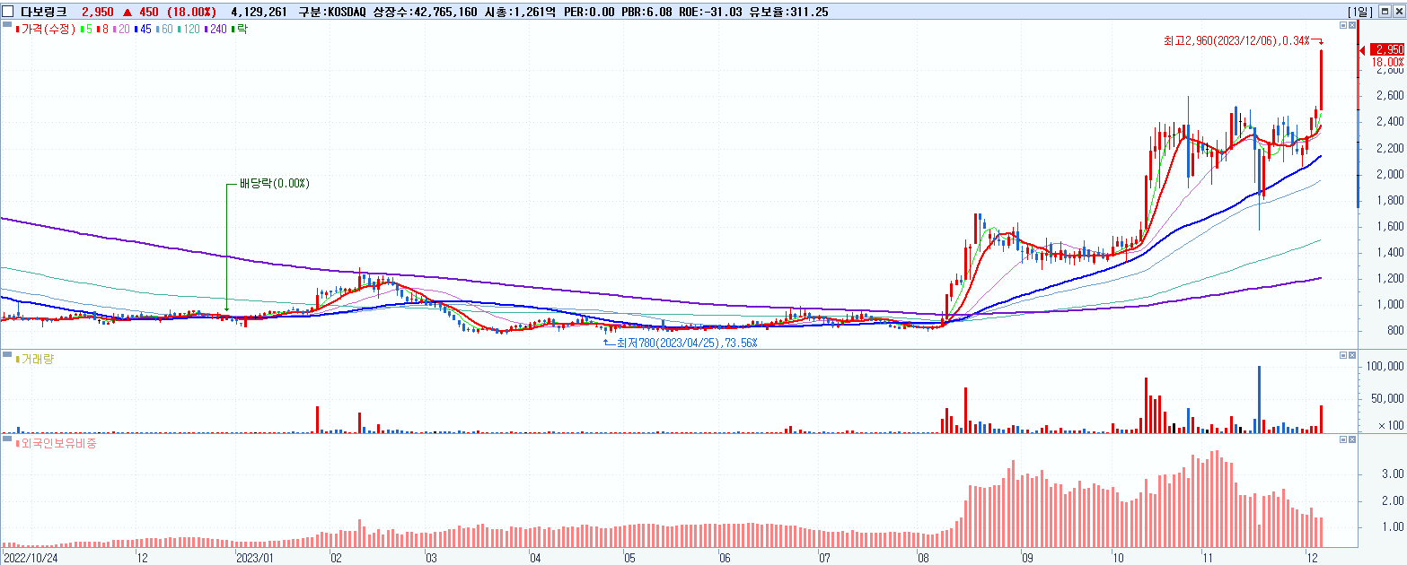 - 다보링크 (2,950원 ▲ 18% , 시총: 1,262억, 거래량: 4,147,569, 거래대금:116억)