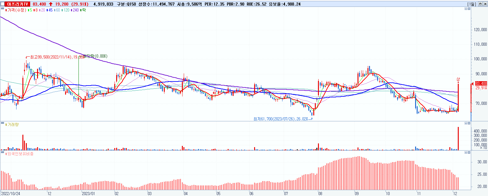 - 아프리카TV (83,400원 ▲ 29.91% , 시총: 9,587억, 거래량: 4,942,853, 거래대금:3,885억)