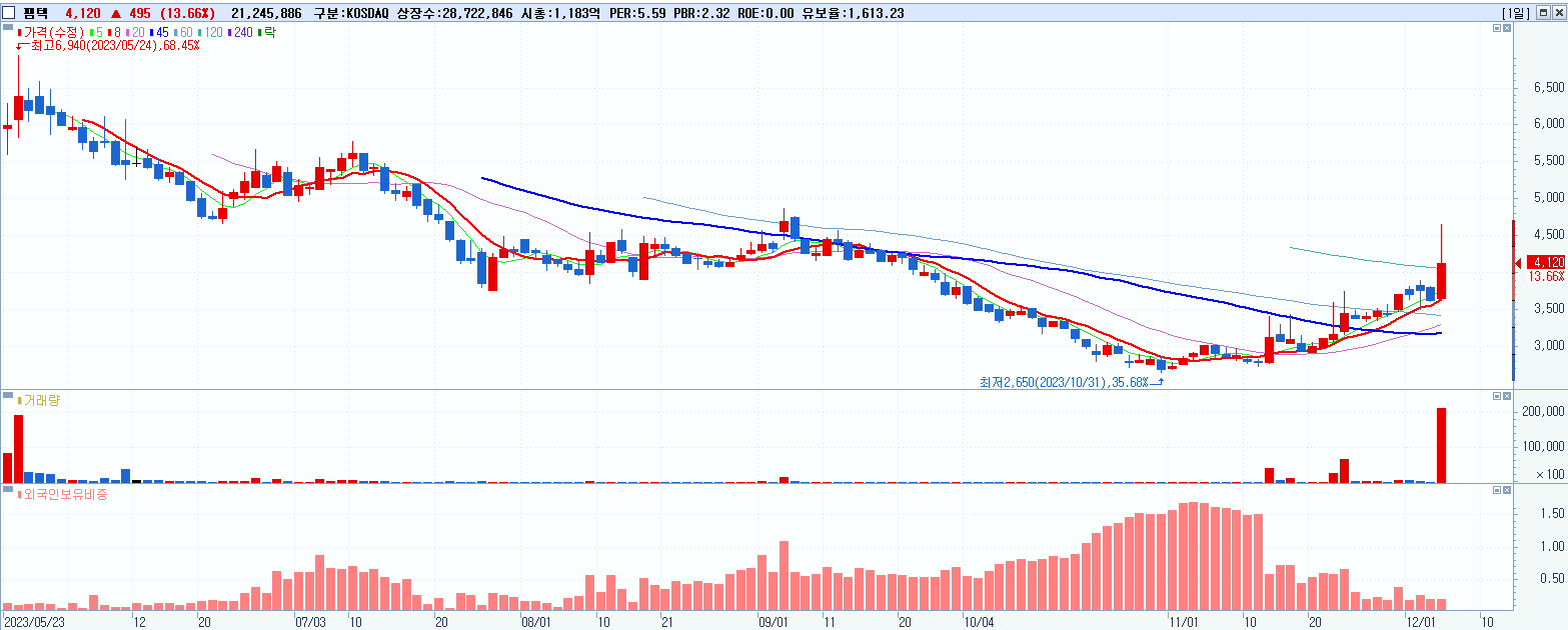 - 팸텍 (4,120원 ▲ 13.66% , 시총: 1,183억, 거래량: 21,278,087, 거래대금:913억)