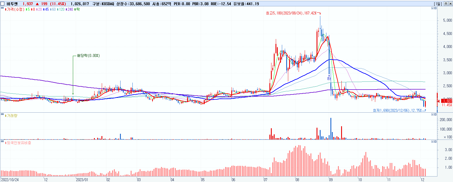 - 비투엔 (1,937원 ▲ 11.45% , 시총: 653억, 거래량: 1,027,921, 거래대금:19억)