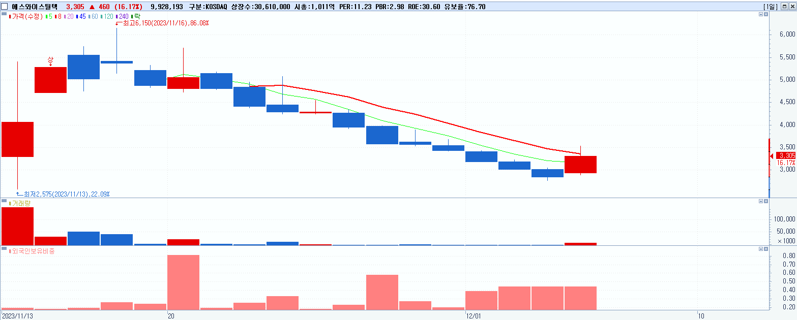 - 에스와이스틸텍 (3,305원 ▲ 16.17% , 시총: 1,012억, 거래량: 10,008,839, 거래대금:332억)