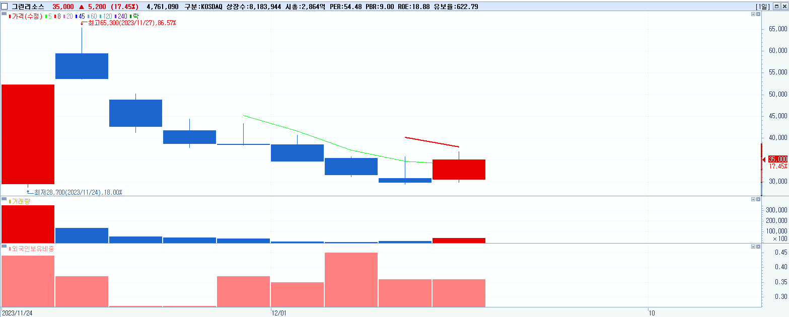 - 그린리소스 (35,000원 ▲ 17.45% , 시총: 2,864억, 거래량: 4,793,871, 거래대금:1,632억)