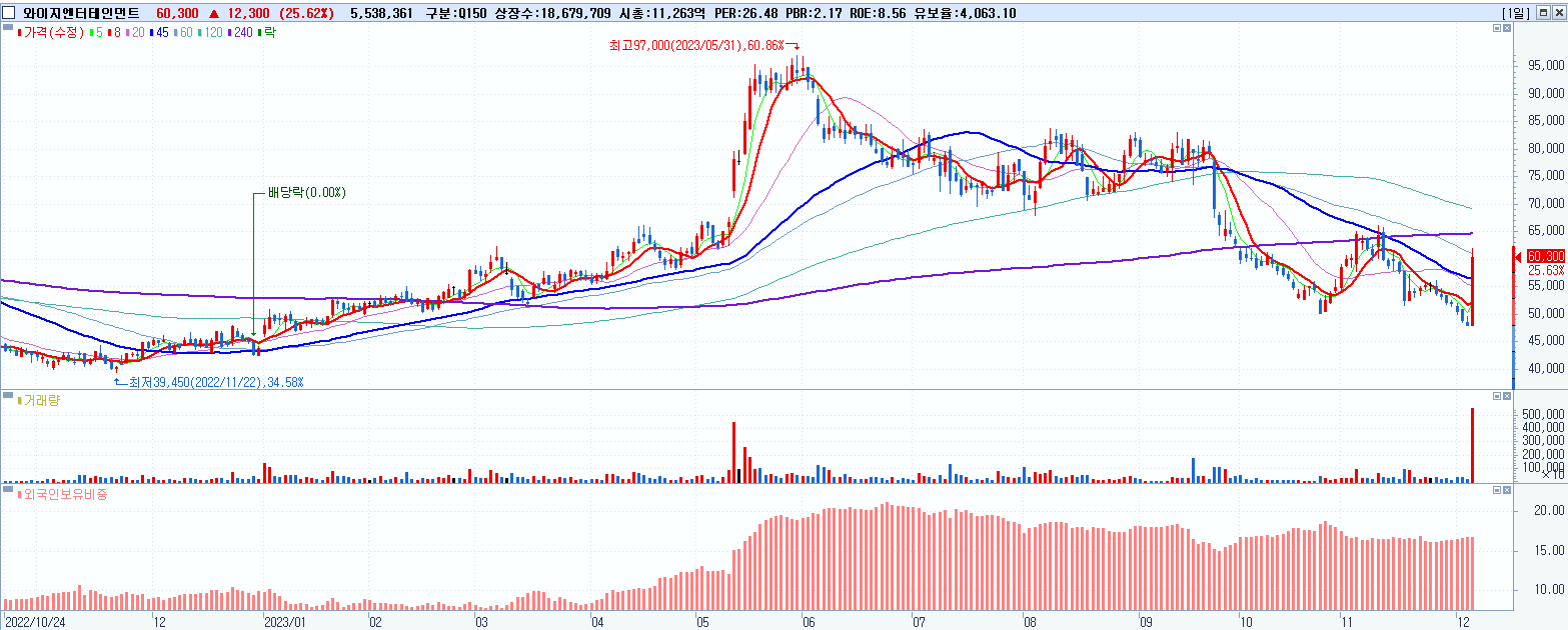- 와이지엔터테인먼트 (60,300원 ▲ 25.63% , 시총: 11,264억, 거래량: 5,563,728, 거래대금:3,261억)