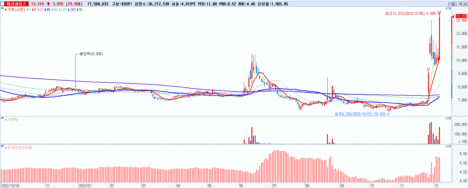 3.대상홀딩스 13,310원 ▲ 29.98% (KOSPI, 084690)