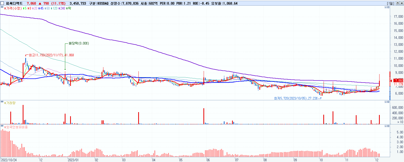 - 피씨디렉트 (7,860원 ▲ 11.17% , 시총: 603억, 거래량: 3,454,630, 거래대금:285억)