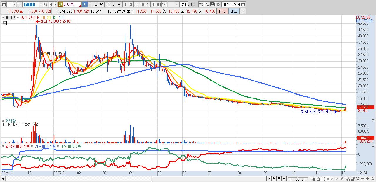29.에이텍 11,660원 ▲ 11.58% (KOSDAQ, 045660)