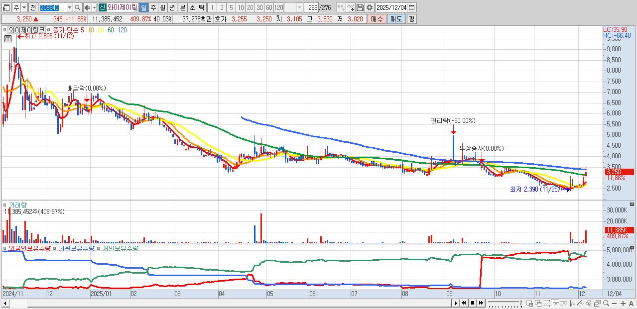- 와이제이링크 (3,250원 ▲ 11.88% , 시총: 924억, 거래량: 11,385,452, 거래대금:373억)