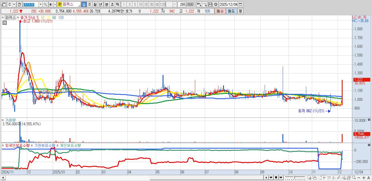 - 파커스 (1,222원 ▲ 30% , 시총: 172억, 거래량: 3,754,000, 거래대금:43억)
