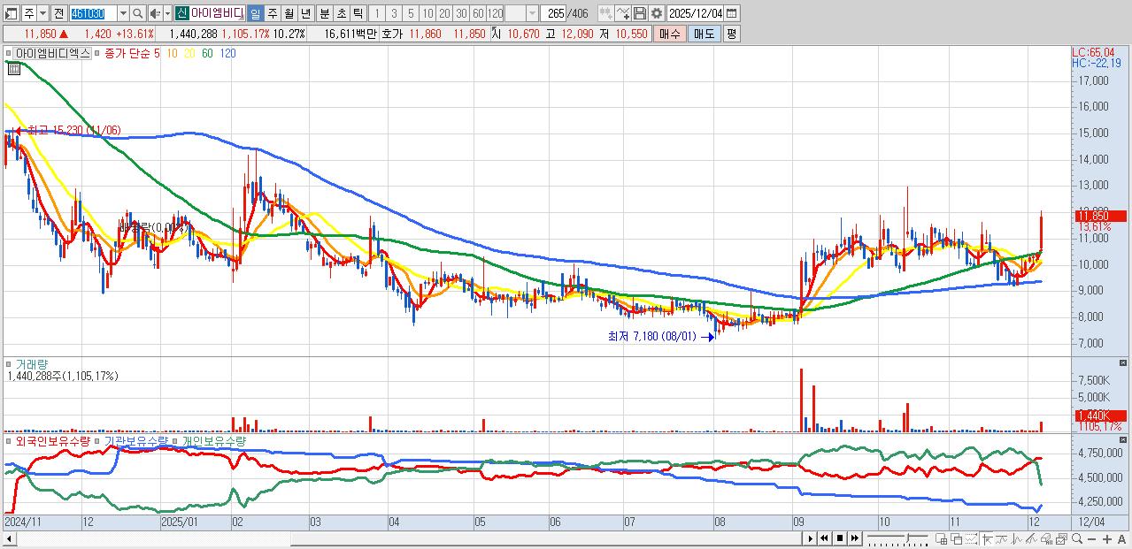 - 아이엠비디엑스 (11,850원 ▲ 13.61% , 시총: 1,661억, 거래량: 1,440,288, 거래대금:166억)