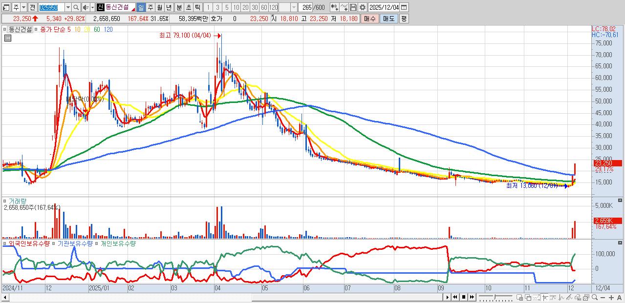 - 동신건설 (23,250원 ▲ 29.82% , 시총: 1,953억, 거래량: 812,124, 거래대금:183억)