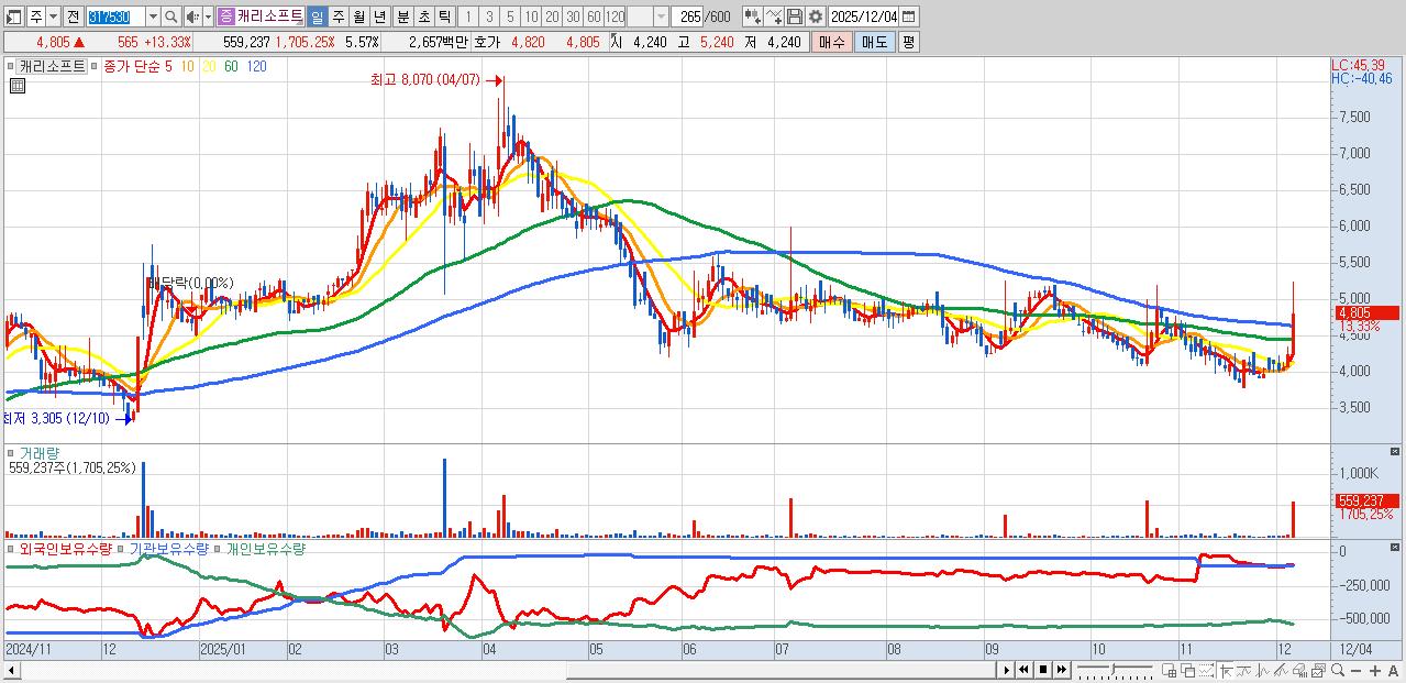 - 캐리소프트 (4,805원 ▲ 13.33% , 시총: 482억, 거래량: 559,237, 거래대금:27억)