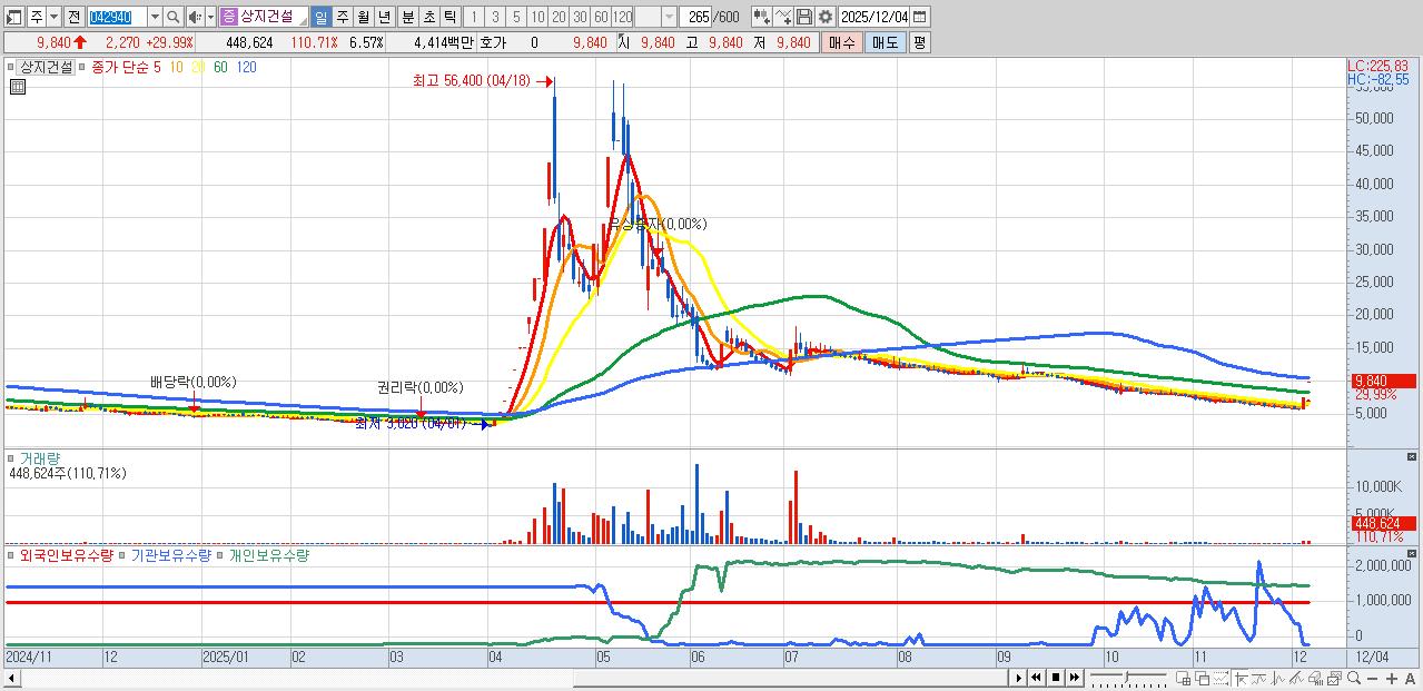 - 상지건설 (9,840원 ▲ 29.99% , 시총: 672억, 거래량: 448,624, 거래대금:44억)