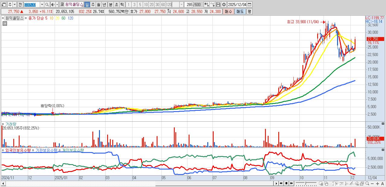- 원익홀딩스 (27,750원 ▲ 16.11% , 시총: 21,434억, 거래량: 20,653,105, 거래대금:5,608억)