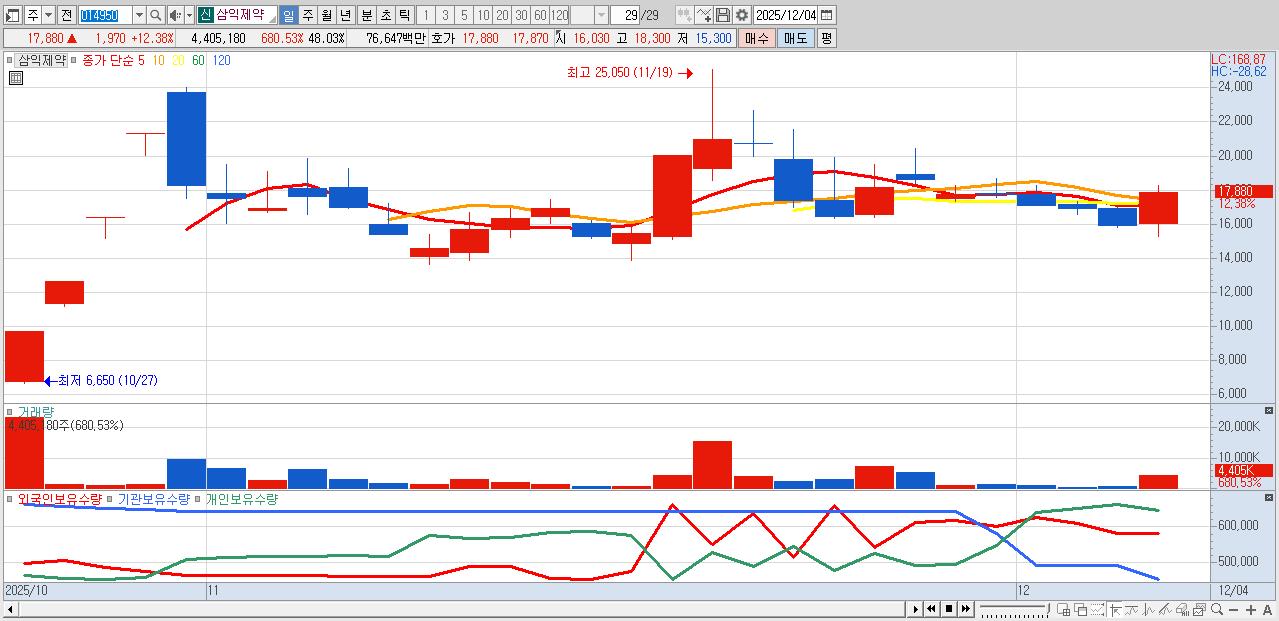 - 삼익제약 (17,880원 ▲ 12.38% , 시총: 1,640억, 거래량: 4,405,180, 거래대금:766억)