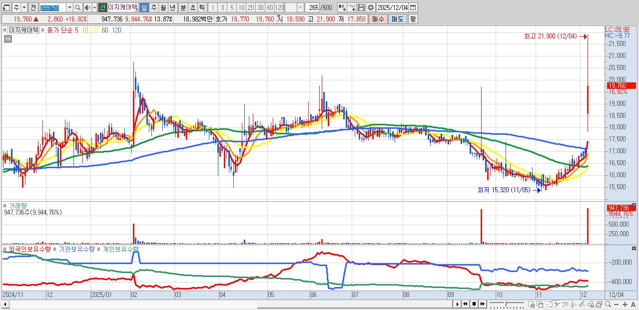 - 이지케어텍 (19,760원 ▲ 16.92% , 시총: 1,351억, 거래량: 947,736, 거래대금:190억)