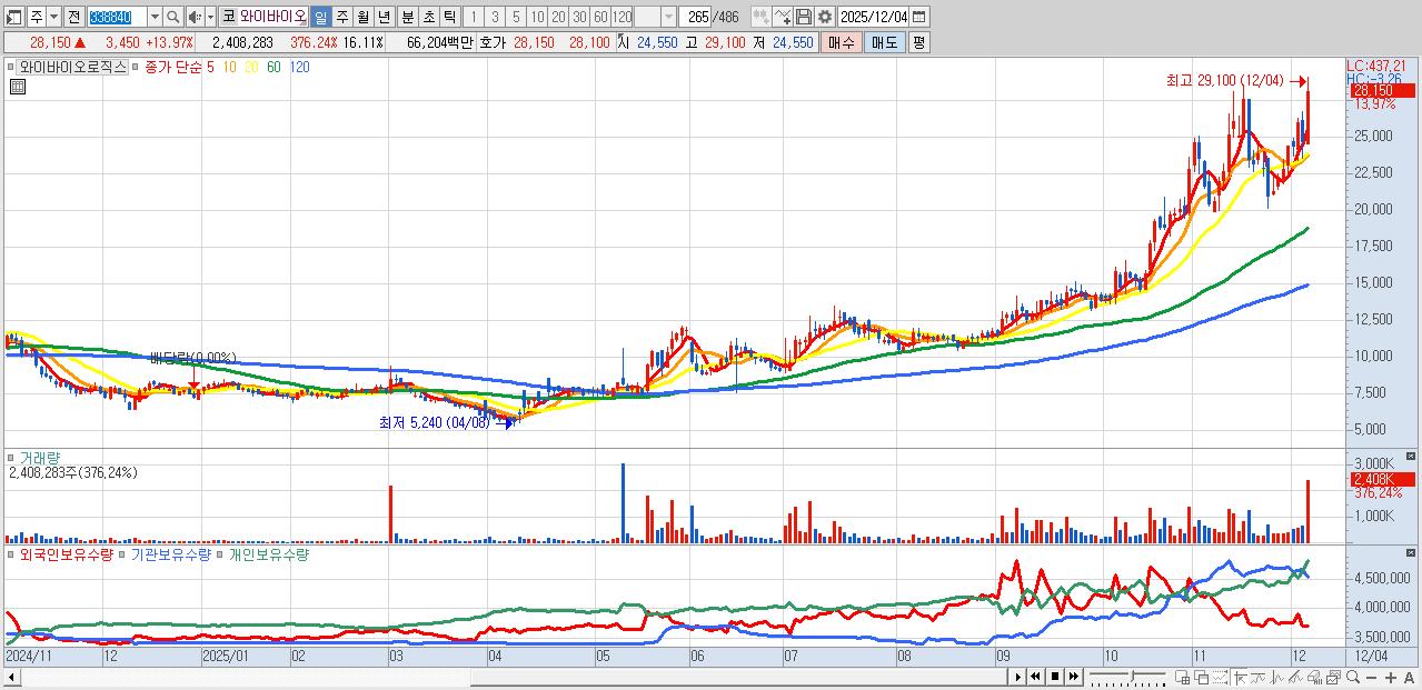 - 와이바이오로직스 (28,150원 ▲ 13.97% , 시총: 4,208억, 거래량: 2,408,283, 거래대금:662억)
