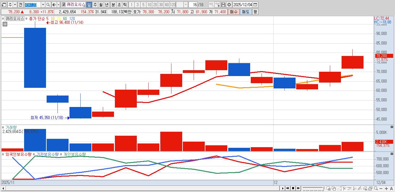 - 큐리오시스 (78,200원 ▲ 11.87% , 시총: 5,948억, 거래량: 2,429,654, 거래대금:1,881억)