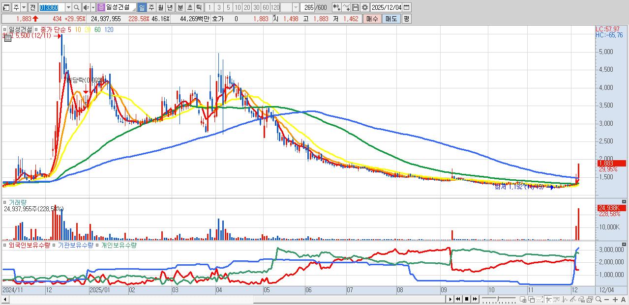 - 일성건설 (1,883원 ▲ 29.95% , 시총: 1,017억, 거래량: 24,937,955, 거래대금:443억)