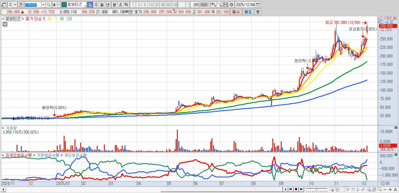 - 로보티즈 (288,000원 ▲ 12.72% , 시총: 41,962억, 거래량: 3,059,116, 거래대금:8,812억)