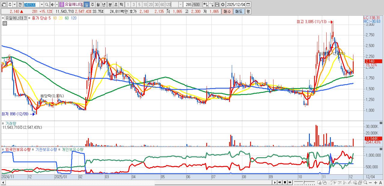- 유일에너테크 (2,140원 ▲ 15.12% , 시총: 732억, 거래량: 11,543,710, 거래대금:248억)