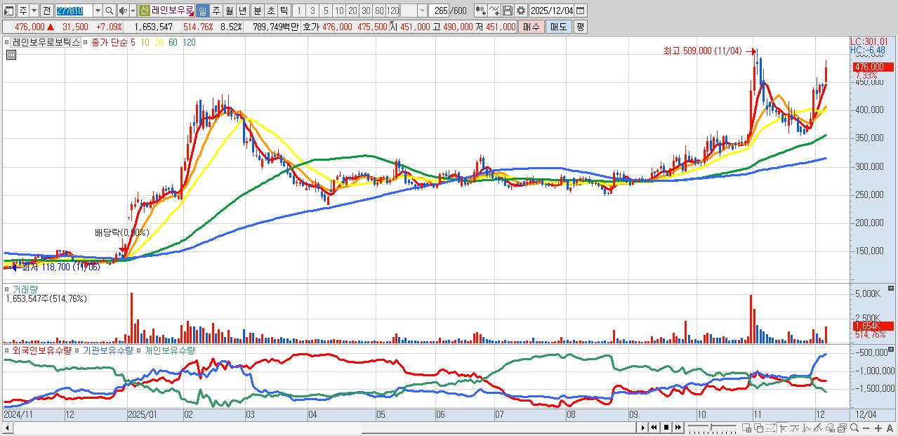 - 레인보우로보틱스 (472,500원 ▲ 6.3% , 시총: 91,664억, 외국인 순매수 거래금:342억)