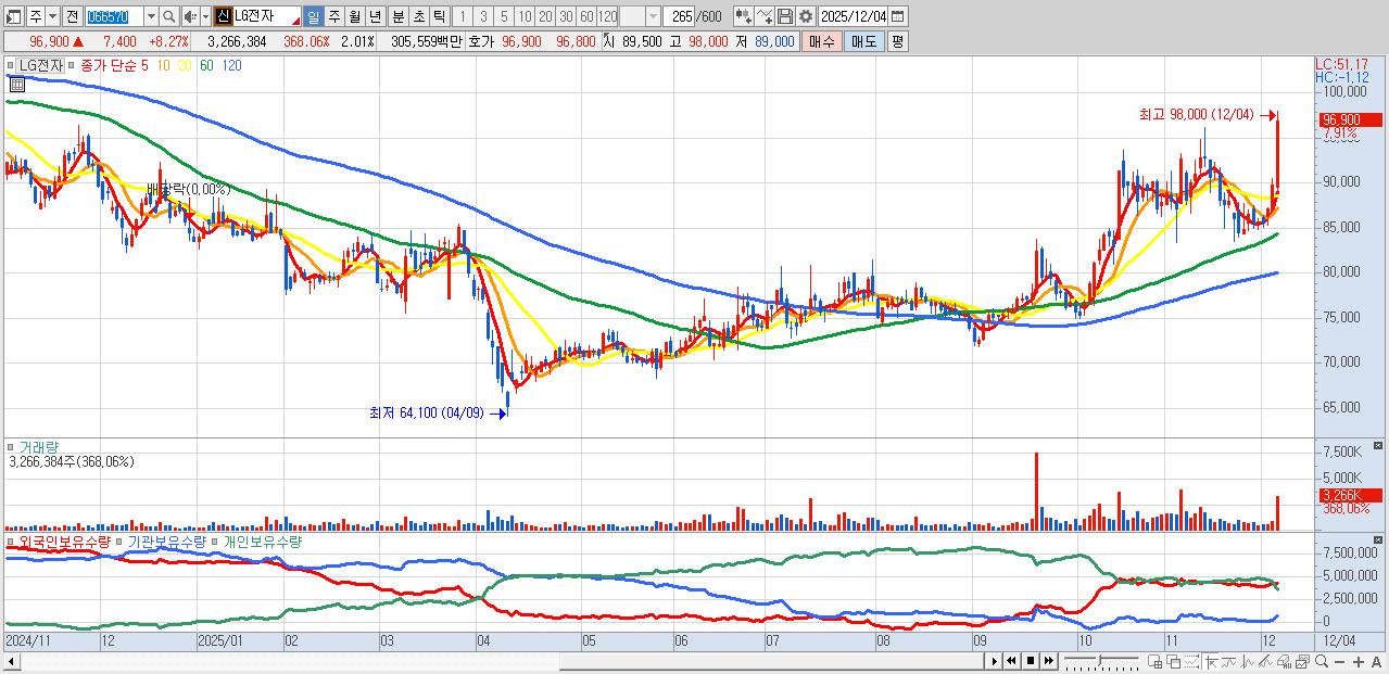 - LG전자 (94,800원 ▲ 5.92% , 시총: 154,416억, 외국인 순매수 거래금:586억)