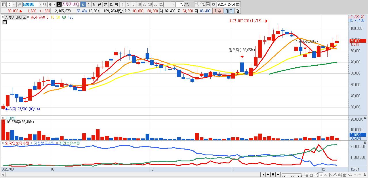- 지투지바이오 (89,000원 ▲ 1.83% , 시총: 14,470억, 거래량: 2,105,878, 거래대금:1,898억)