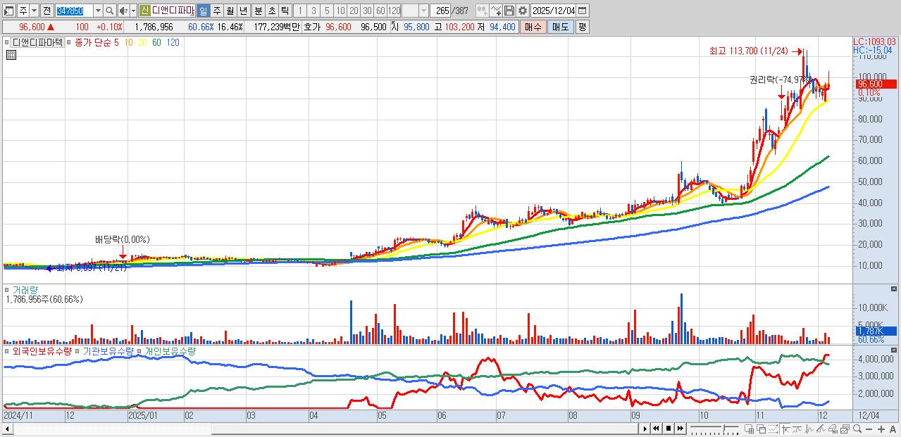 - 디앤디파마텍 (96,600원 ▲ 0.1% , 시총: 10,487억, 거래량: 1,786,956, 거래대금:1,772억)