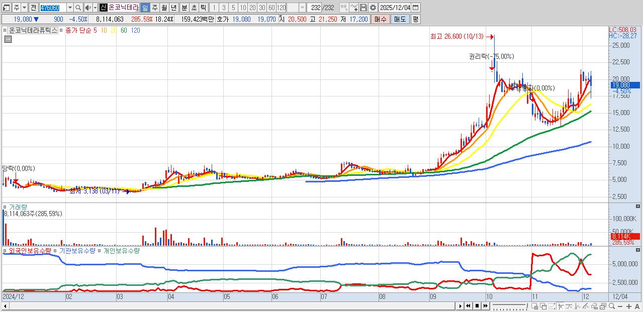 - 온코닉테라퓨틱스 (19,080원 ▼ -4.5% , 시총: 8,489억, 거래량: 8,114,063, 거래대금:1,594억)