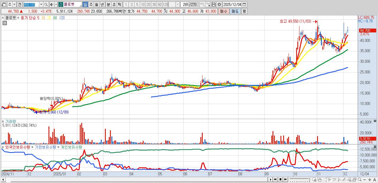 - 클로봇 (44,700원 ▲ 3.47% , 시총: 11,171억, 거래량: 5,911,124, 거래대금:2,668억)