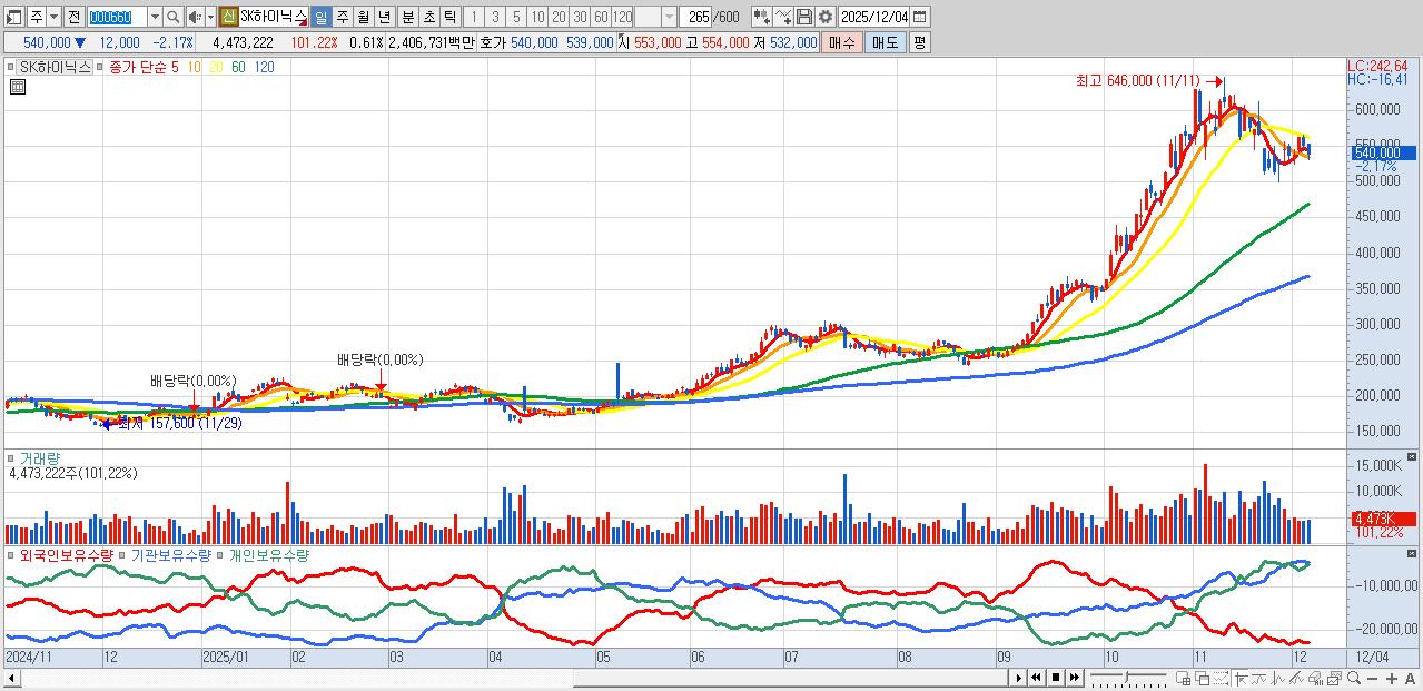- SK하이닉스 (542,000원 ▼ -1.81% , 시총: 3,945,773억, 거래량: 2,858,305, 거래대금:15,352억)