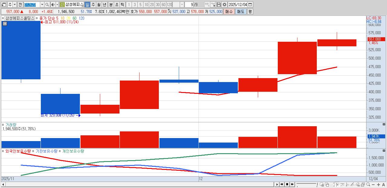 - 삼성에피스홀딩스 (557,000원 ▲ 1.46% , 시총: 138,599억, 거래량: 1,946,500, 거래대금:10,825억)