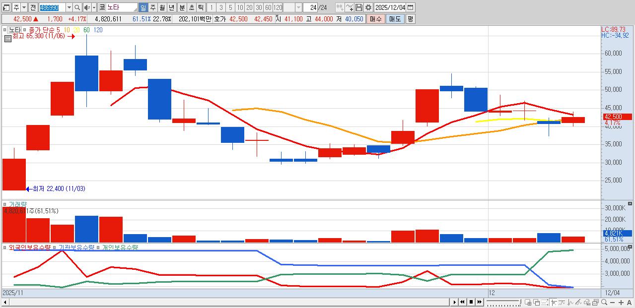 - 노타 (42,500원 ▲ 4.17% , 시총: 8,994억, 거래량: 4,820,611, 거래대금:2,021억)