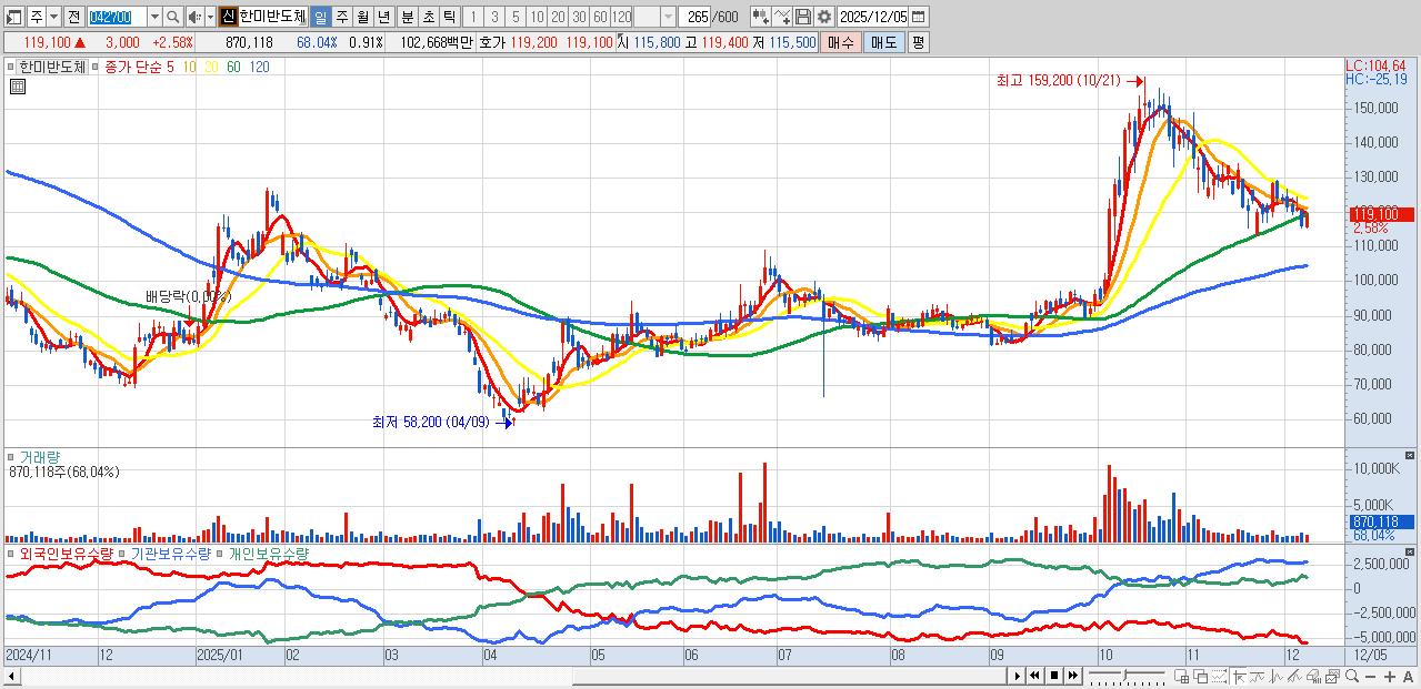 - 한미반도체 (119,100원 ▲ 2.58% , 시총: 113,517억, 외국인 순매수 거래금:128억)