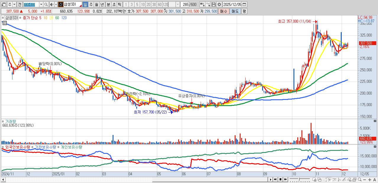 - 삼성SDI (307,500원 ▲ 1.65% , 시총: 247,801억, 외국인 순매수 거래금:95억)
