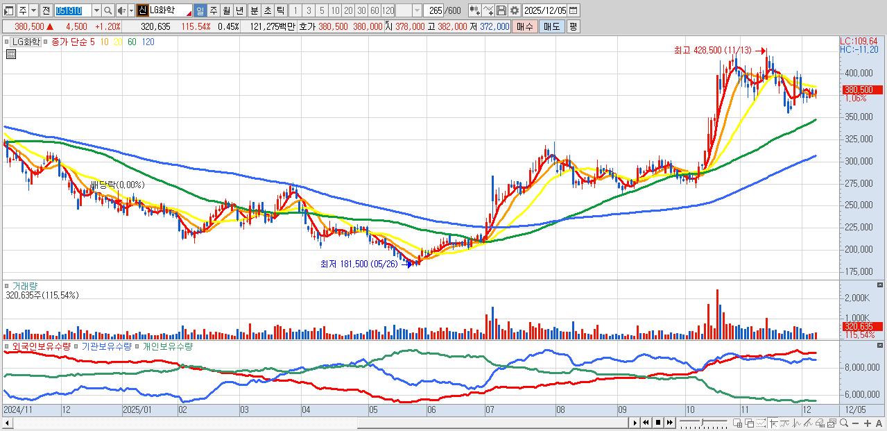- LG화학 (381,500원 ▲ 1.46% , 시총: 269,310억, 외국인 순매수 거래금:99억)