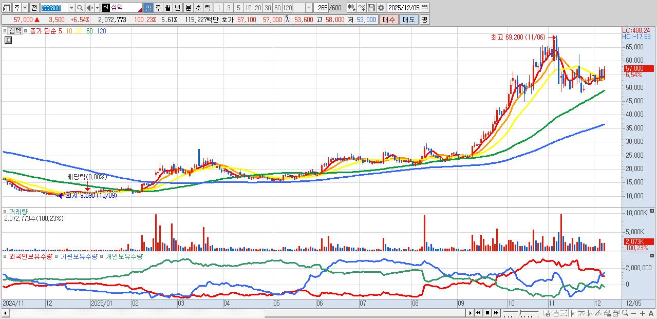 - 심텍 (57,500원 ▲ 7.48% , 시총: 21,246억, 외국인 순매수 거래금:105억)