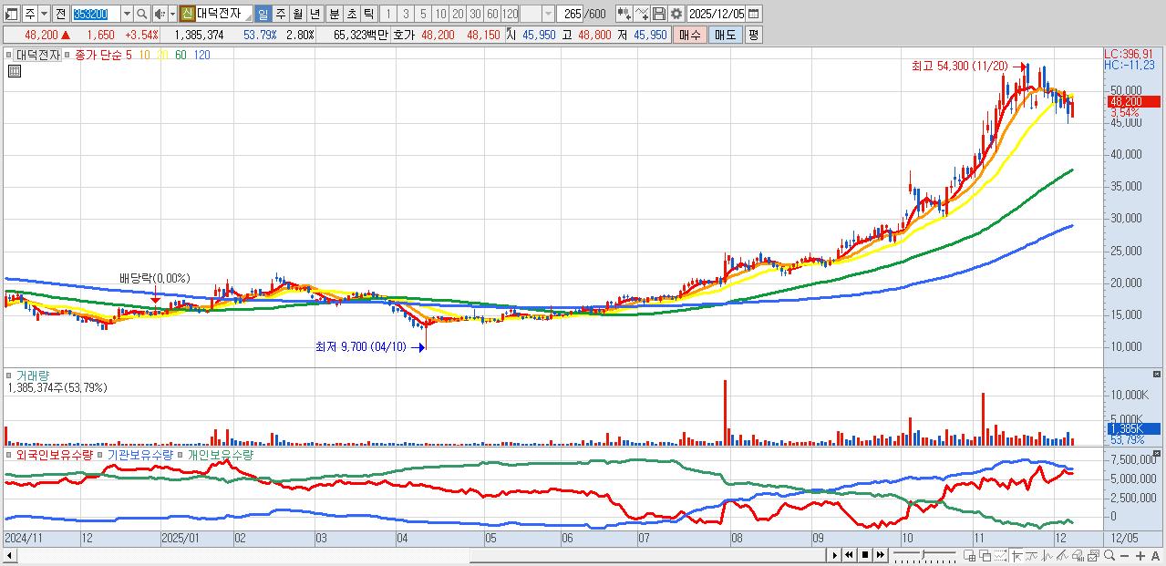 - 대덕전자 (48,200원 ▲ 3.54% , 시총: 23,819억, 외국인 순매수 거래금:209억)