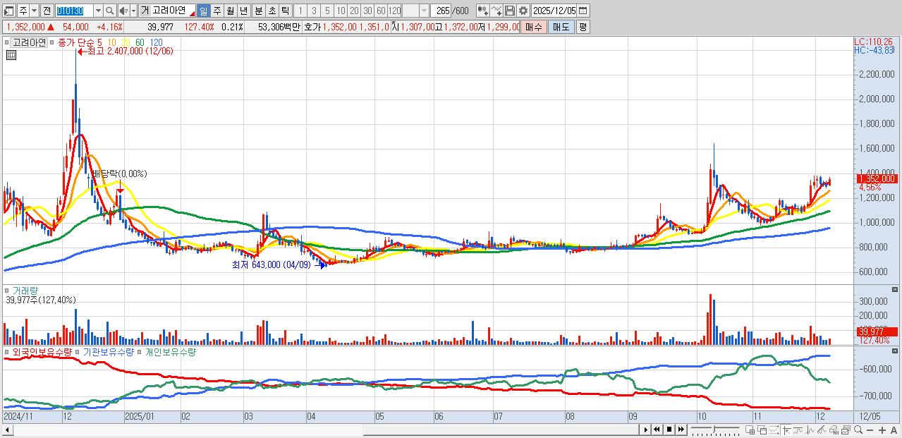 - 고려아연 (1,359,000원 ▲ 4.7% , 시총: 262,875억, 외국인 순매수 거래금:92억)