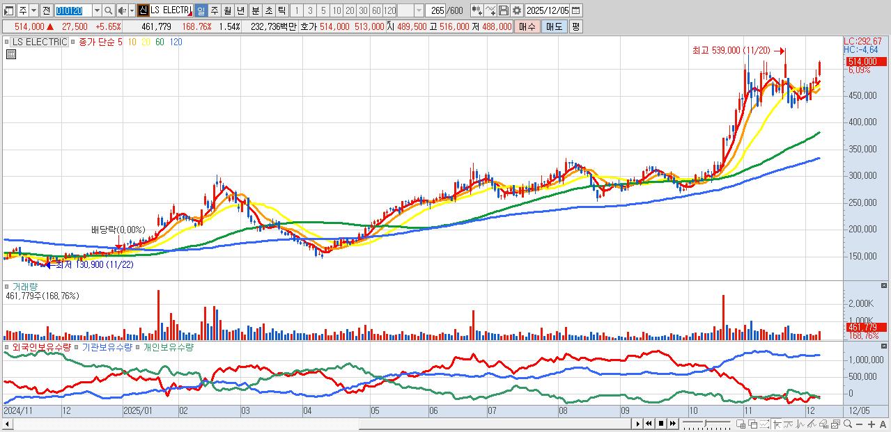 - LS ELECTRIC (515,000원 ▲ 5.86% , 시총: 154,500억, 외국인 순매수 거래금:203억)