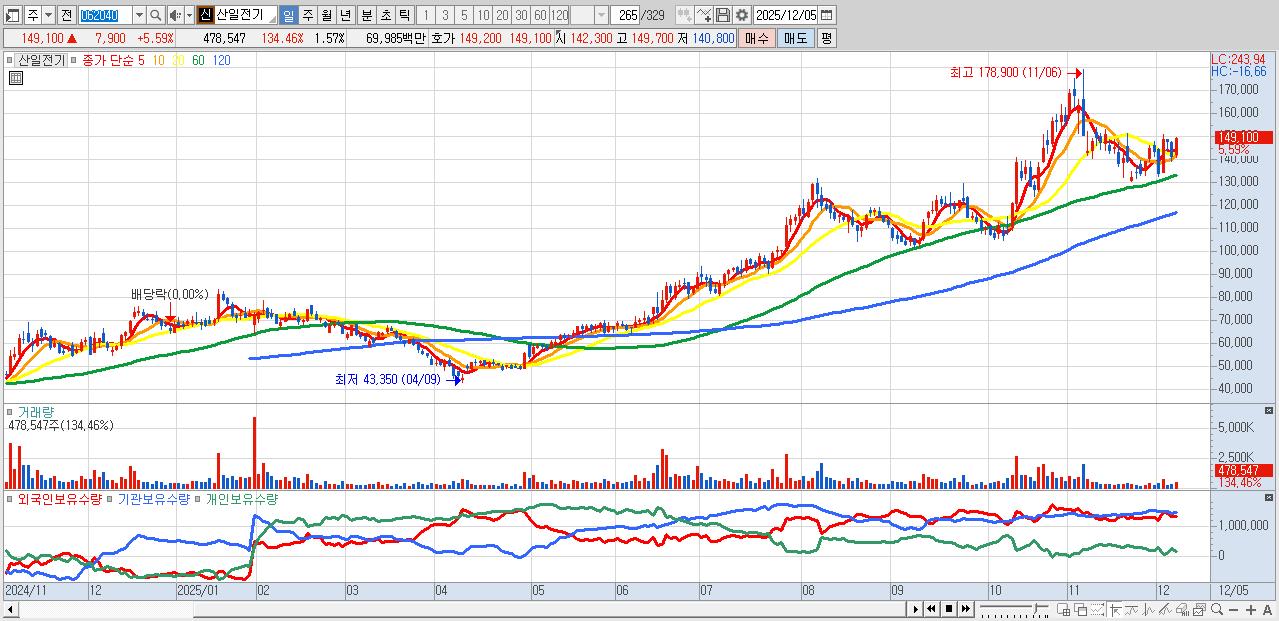 - 산일전기 (149,100원 ▲ 5.59% , 시총: 45,394억, 외국인 순매수 거래금:109억)