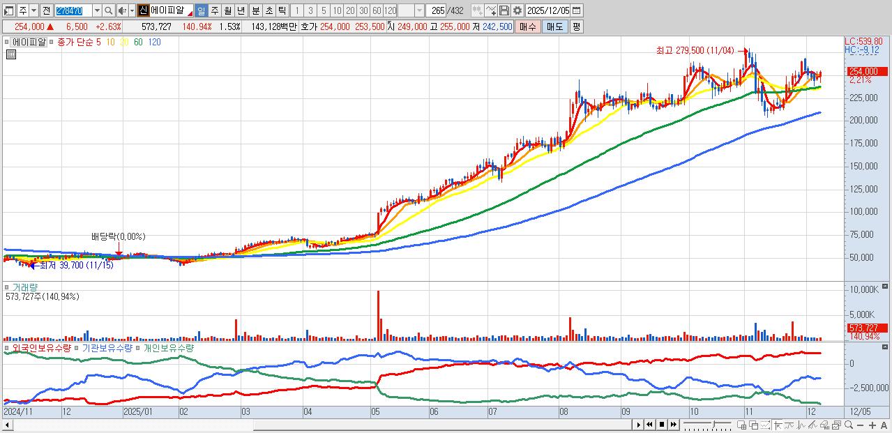 - 에이피알 (254,500원 ▲ 2.83% , 시총: 95,261억, 외국인 순매수 거래금:281억)