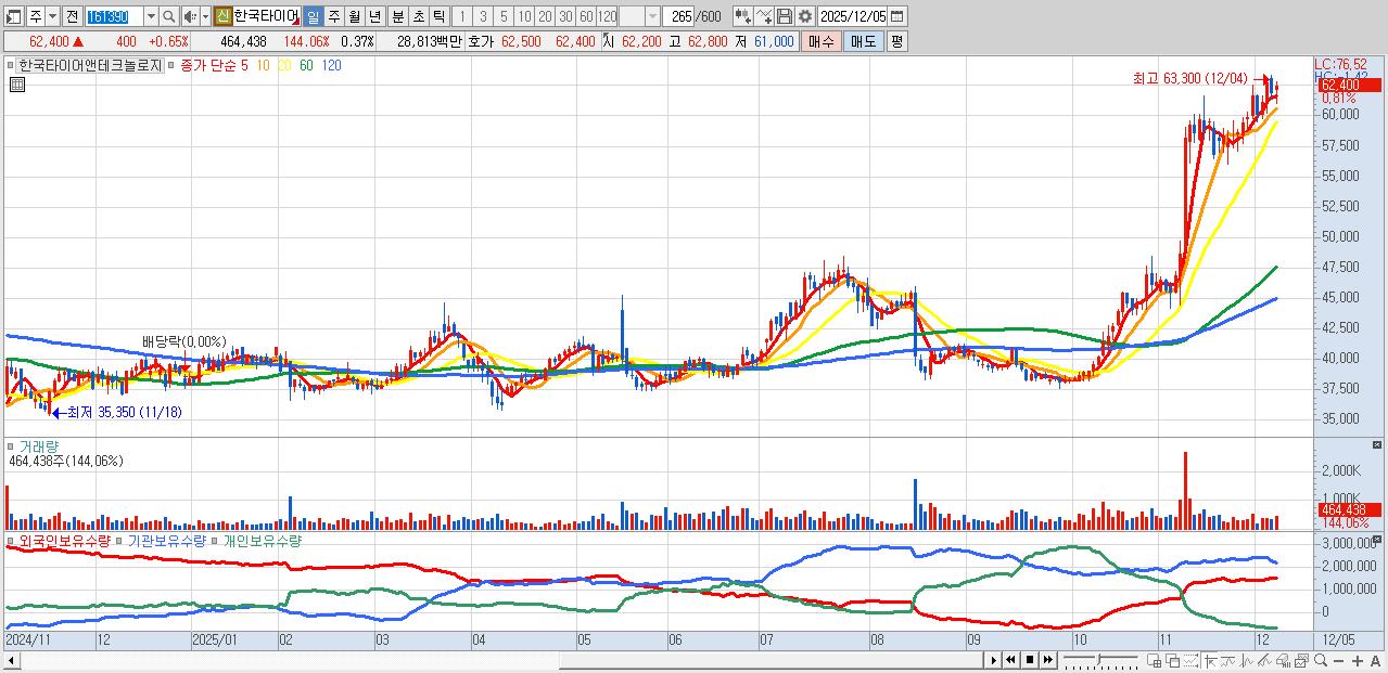 - 한국타이어앤테크놀로지 (62,800원 ▲ 1.29% , 시총: 77,794억, 외국인 순매수 거래금:96억)