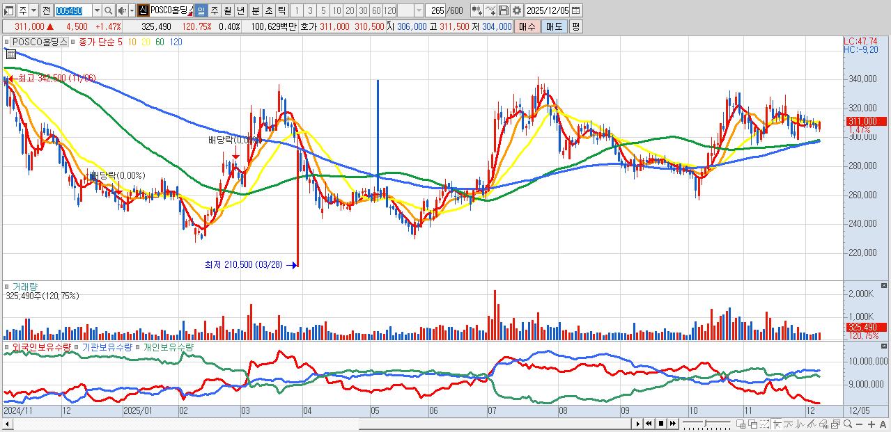 - POSCO홀딩스 (311,000원 ▲ 1.47% , 시총: 251,701억, 외국인 순매수 거래금:133억)