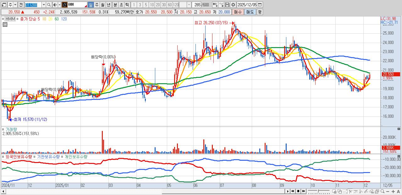 - HMM (20,550원 ▲ 2.24% , 시총: 193,835억, 외국인 순매수 거래금:150억)
