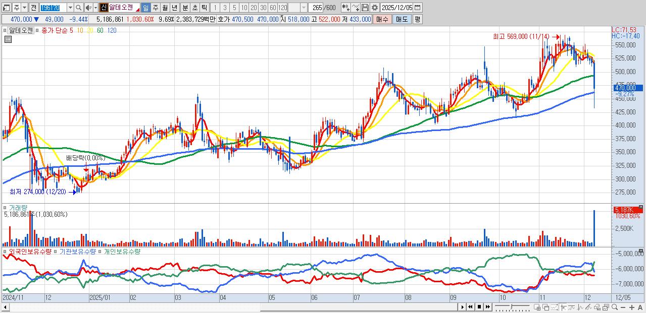 - 알테오젠 (456,500원 ▼ -12.04% , 시총: 244,254억, 거래량: 2,815,855, 거래대금:12,921억)