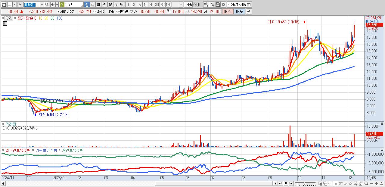 - 우진 (18,860원 ▲ 13.96% , 시총: 3,809억, 거래량: 9,461,032, 거래대금:1,756억)