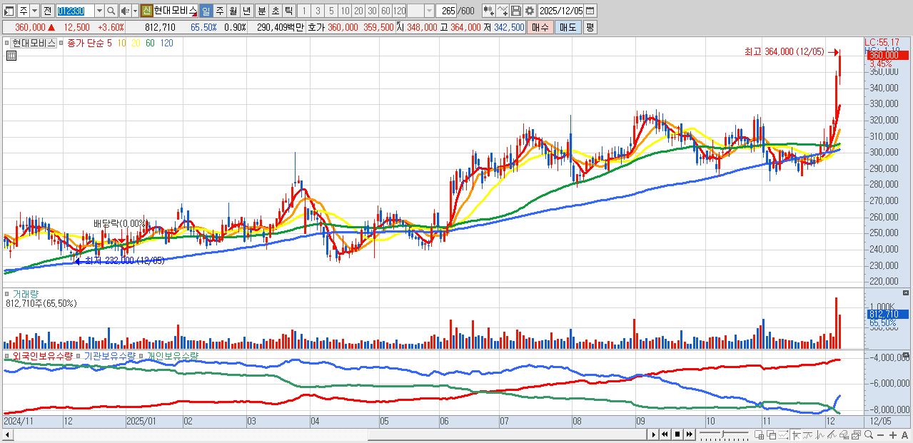 - 현대모비스 (362,500원 ▲ 4.32% , 시총: 328,906억, 거래량: 621,180, 거래대금:2,222억)