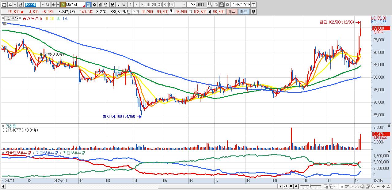 - LG전자 (99,700원 ▲ 5.17% , 시총: 162,398억, 거래량: 2,776,901, 거래대금:2,777억)